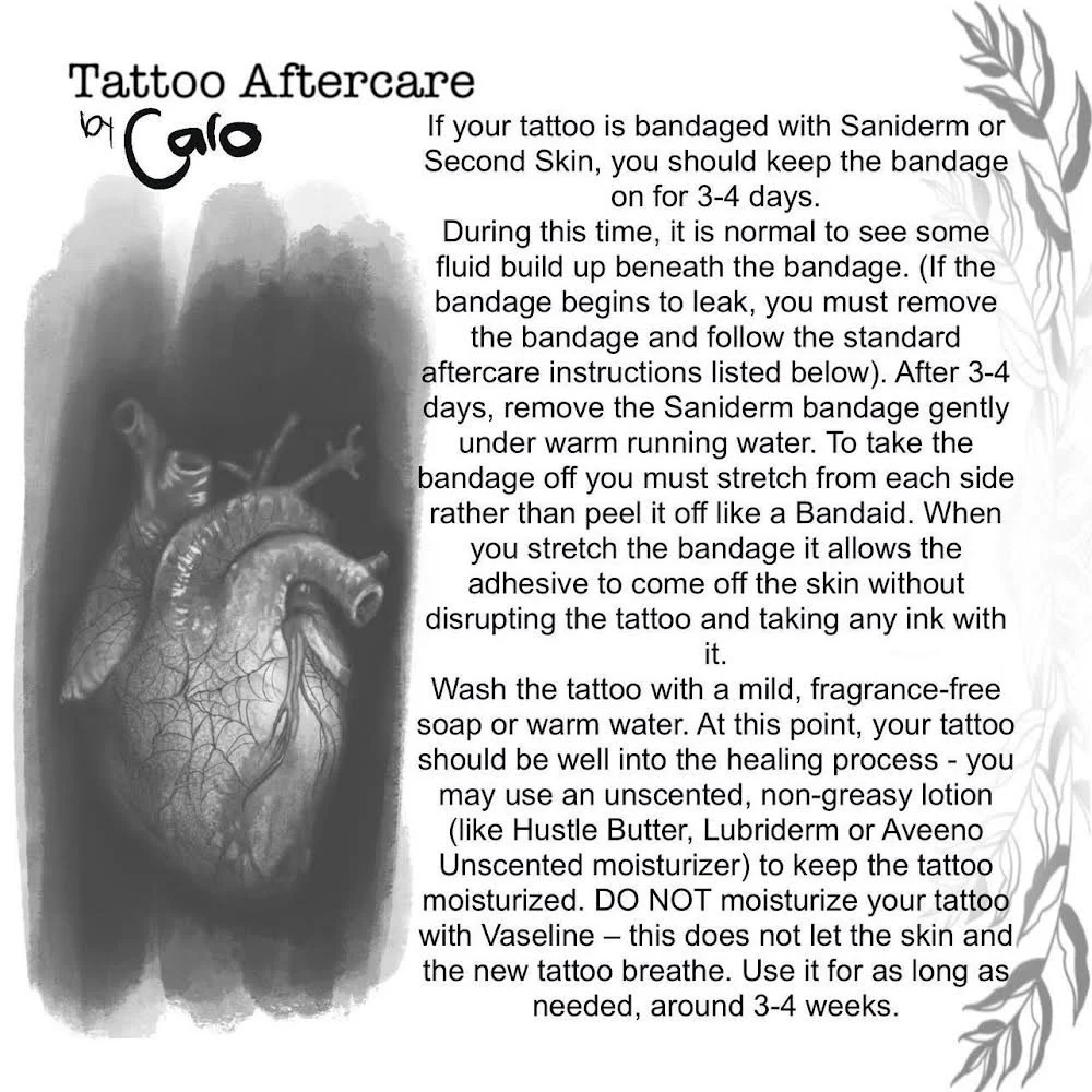 Aftercare Instructions to take care of your fresh tattoo, when its covered with Saniderm/Derm shield or a second skin type of adhesive plastic